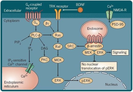 Both β-arrestin- and G protein-mediated signaling cascades might result in ERK activation. Yet, the subcellular distribution of activated ERK1/2 downstream of these two pathways is not the same. The phosphorylated ERK1/2 induced by β-arrestin stays in the cytoplasm, whereas phosphorylated ERK1/2 mediated via heterotrimeric G protein signaling translocates into the nucleus.