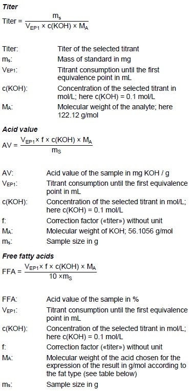 - Acid value, free fatty acids (FFA) according to