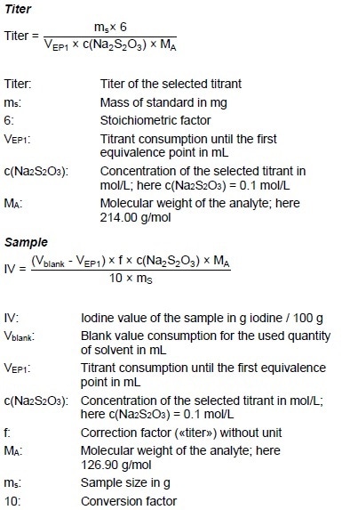 An appropriate amount of sample (see the below calculation) is put into the titration vessel and dissolved in 10 mL acetonitrile. Next, the beakers are covered and the solution is stirred for 30 seconds using stirring rate 8. 10.0 mL TSI solution are added and the sample is covered again and the mixture stirred using stirring rate 4. 0.5 mL distilled water is added after 5 minutes, the lid is closed again and the solution is stirred for another minute using stirring rate 4.