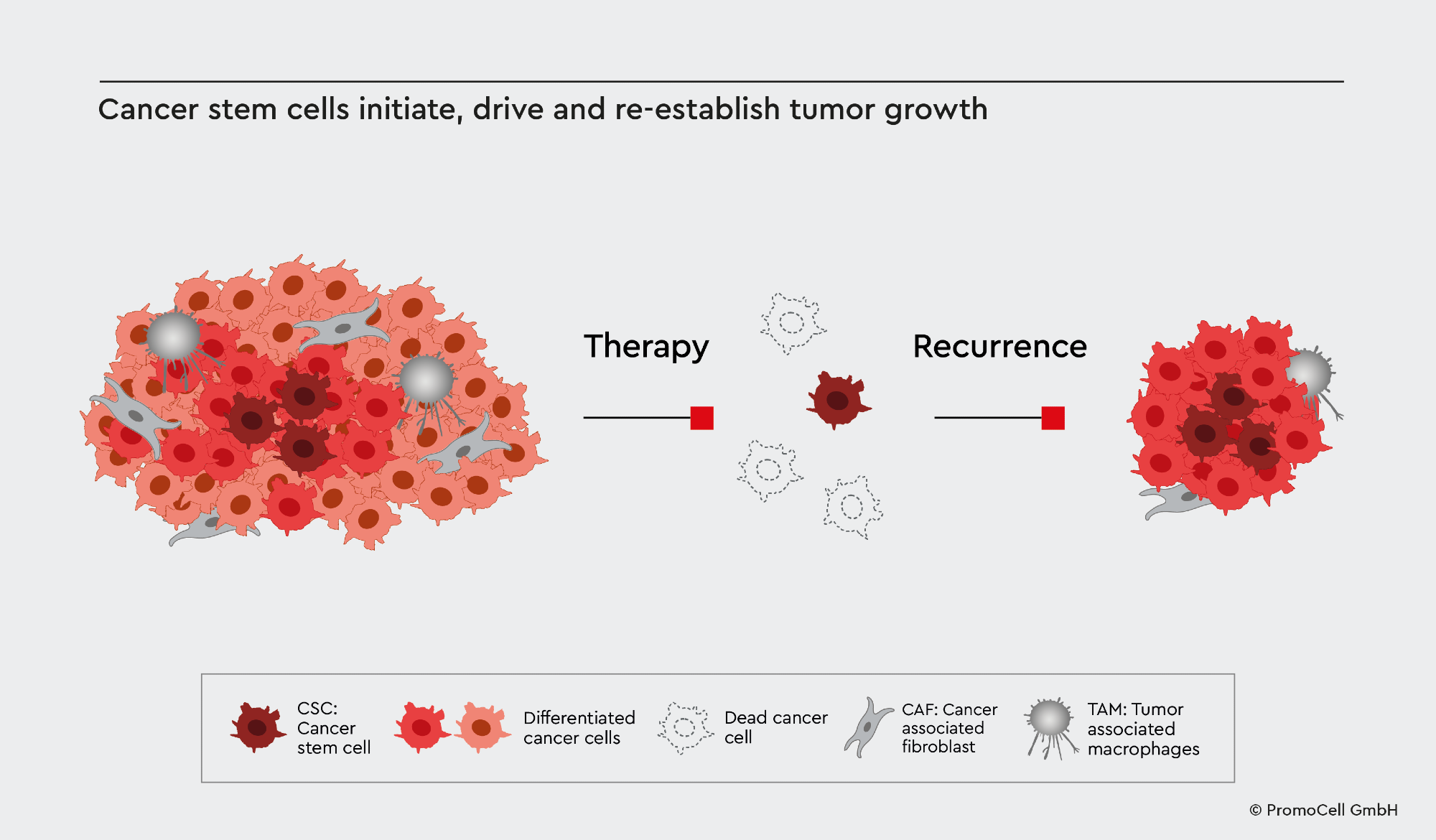 Figure 3. Cancer stem cells initiate, drive and re-establish tumor growth. The resistance of CSCs to conventional treatment leads to cancer recurrence in the majority of tumor patients after conventional therapy. Image Credit: PromoCell