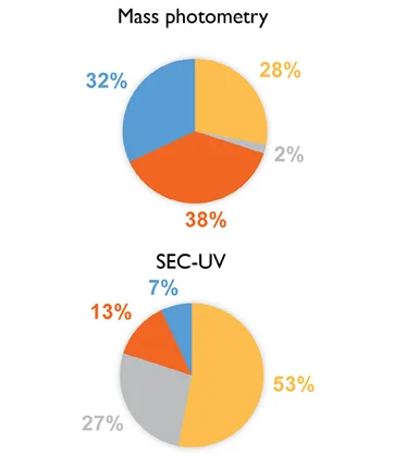 In both cases, SEC and mass photometry were found to provide comparable results. Where there were differences in the data captured by both techniques, it is most likely that these relate to the parameters and/or criteria used for peak integration.