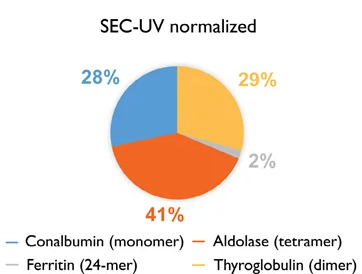 SEC-UV suggests that thyroglobulin and ferritin are the most abundant in this example, while mass photometry suggests that conalbumin and aldolase are the most abundant. To properly understand this discrepancy, it is important to consider the fundamental principles of each technique and its use.