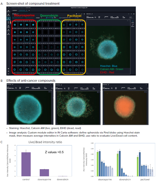 To properly define spheroids sizes and intensities with various channels, CME analysis protocol in IN Carta® Image Analysis Software was applied. Observed shifts in spheroid area and average intensities as well as ratios of live/dead average intensities were applied to assess any compound effects. For a comprehensive phenotypic characterization of cells, it is advisable to use the ImageXpress® Micro Confocal system.