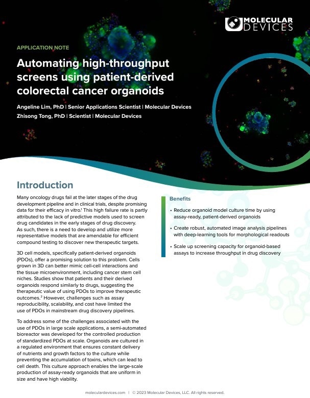 Molecular Devices developed an end-to-end, automated workflow, beginning with assay-ready colorectal cancer organoids, comprising establishment in culture, maintenance, and screening. Automation protocols were applied for routine monitoring in culture, pre- and post-treatment. Compound effects were also monitored over time.