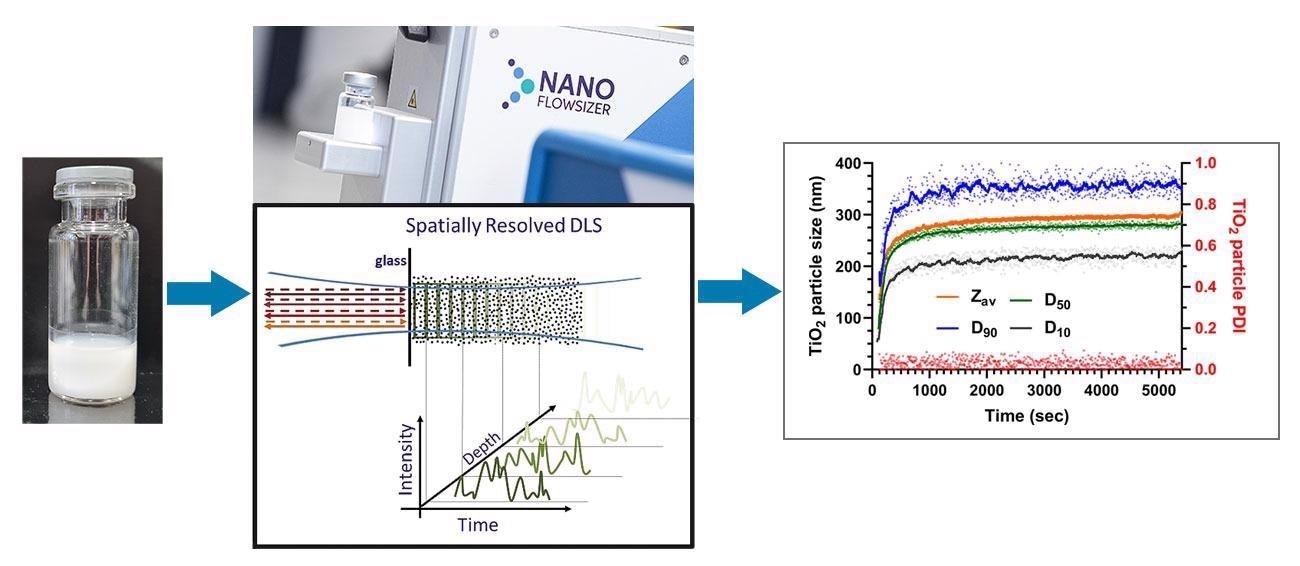 To monitor TiO2 (and other) nano-synthesis processes more effectively and efficiently, via direct, inline size analysis, InProcess-LSP (a Dutch Process Analytical Technology [PAT] company) has invented and commercialized a new technology for NP size characterization in highly turbid suspensions without the need for diluting. This technology, termed Spatially Resolved Dynamic Light Scattering (SR-DLS), not only provides rapid real-time sizing of highly turbid nanosuspensions, but also allows to perform such analysis for many different sample/process environments and during suspension flow, offering the desired inline NP sizing capability. Currently, an instrument based on SR-DLS (the Nanoflowsizer) is commercially available and provides automated TiO2 particle sizing in concentrated, turbid, and flowing suspensions during both particle formation and processing.