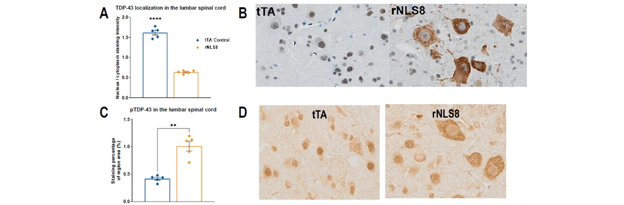 Figure 6. A) Total TDP-43 IHC staining in the lumbar spinal cord as a ratio of nuclear vs. cytoplasmic intensity. Mean±SEM . tTA, n=3F+2M, rNLS8, n=2F+3M. **** p < 0.0001, Welch’s t-test. B) Total TPD-43 example IHC images from a tTA and rNLS8 mouse. C) pTDP-43 staining intensity in the lumbar spinal cord. ** p < 0.01, Welch’s t-test. D) pTDP-43 example IHC images from a tTA and rNLS8 mouse. Image Credit: Charles River Laboratories.