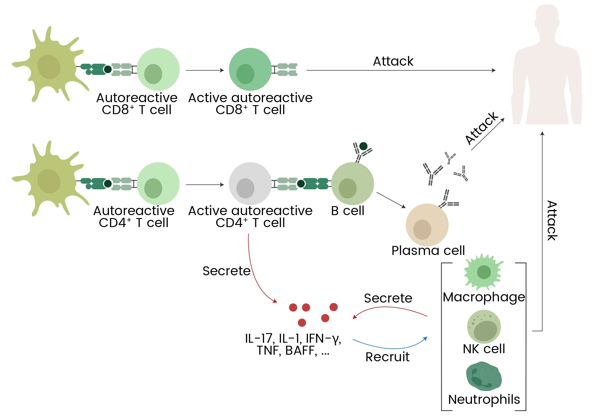 Figure 1. Autoreactive T cells, B cells, macrophages, NK cells, neutrophils, and cytokines (IL-17, IL-1, IFN-γ, TNF, BAFF) contribute to autoimmune responses and inflammation. 7 Image Credit: Sino Biological Inc.